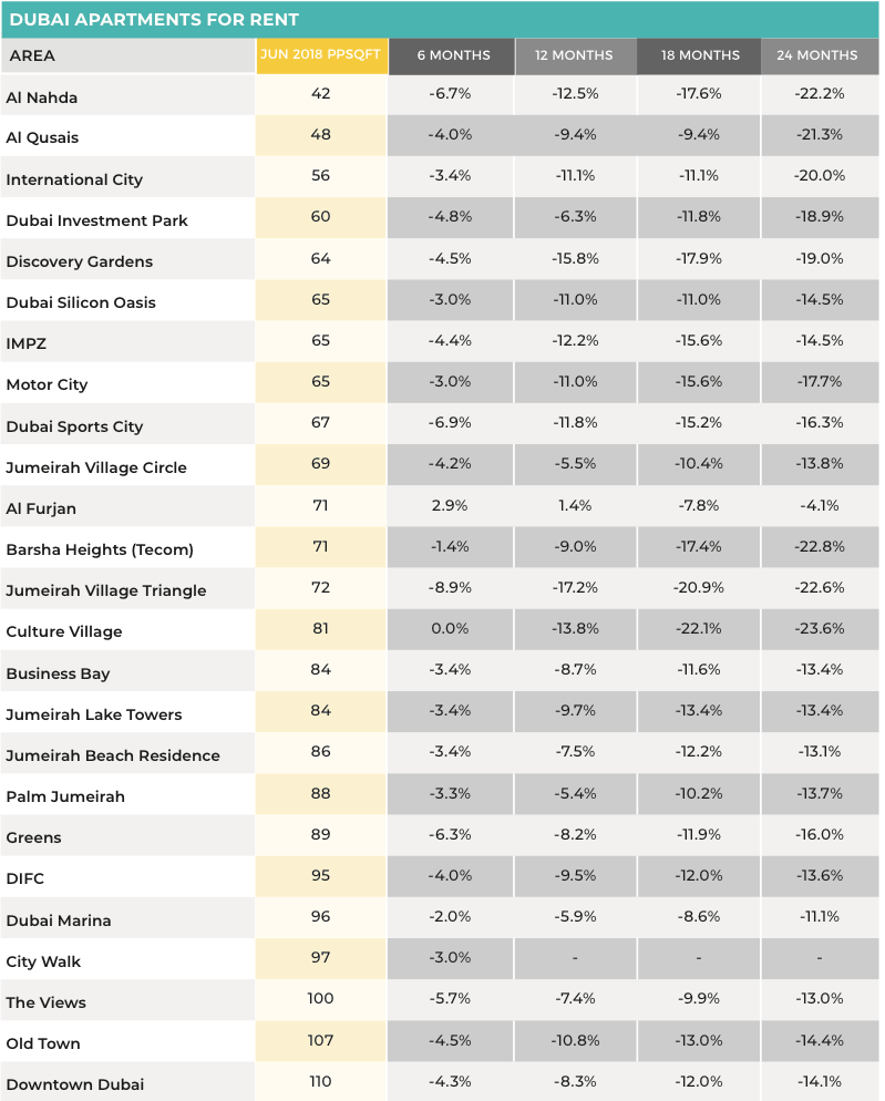 Rents in Dubai have fallen 5.8% in the last six months, and 18.2% over the last two years, with a median price per square foot of AED 81. Only one community, Al Furjan, witnessed a modest increase in six months, while the rest have seen low single digit percentage declines in asking prices.